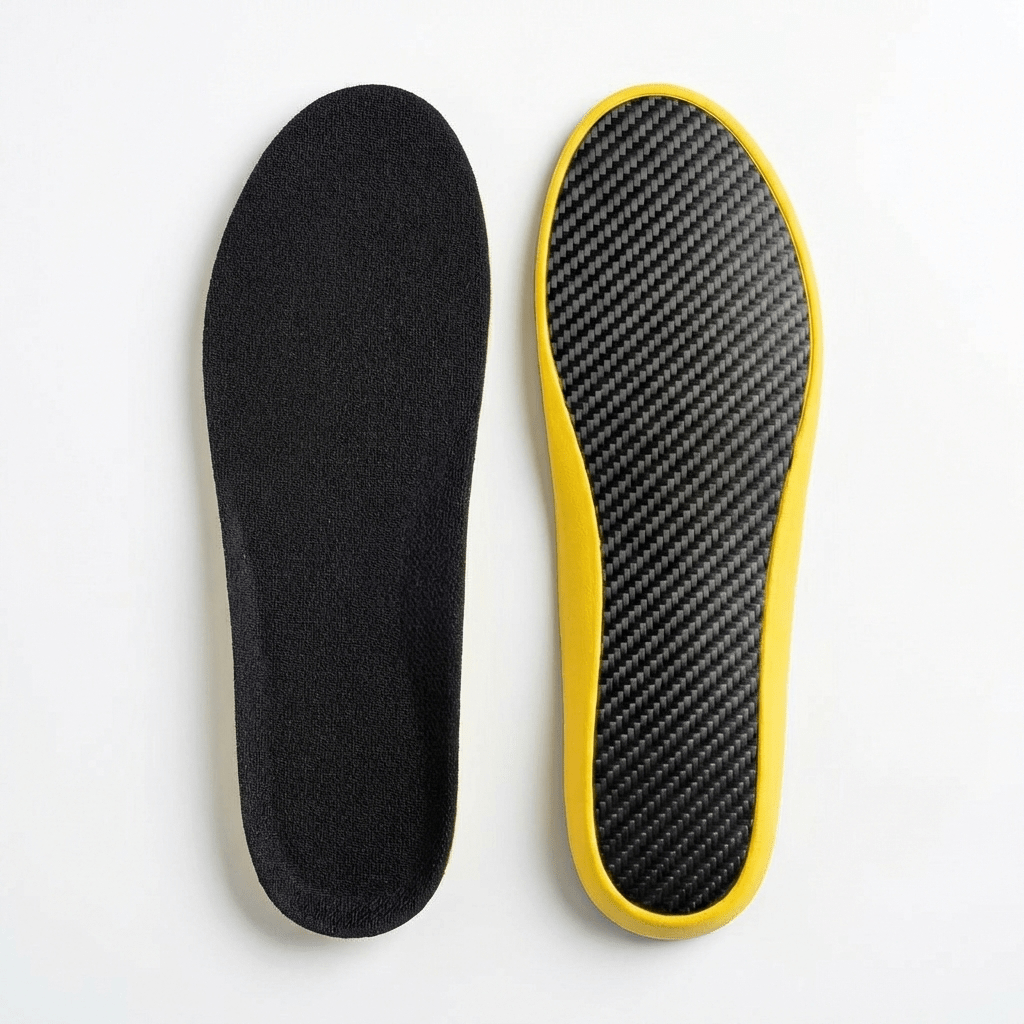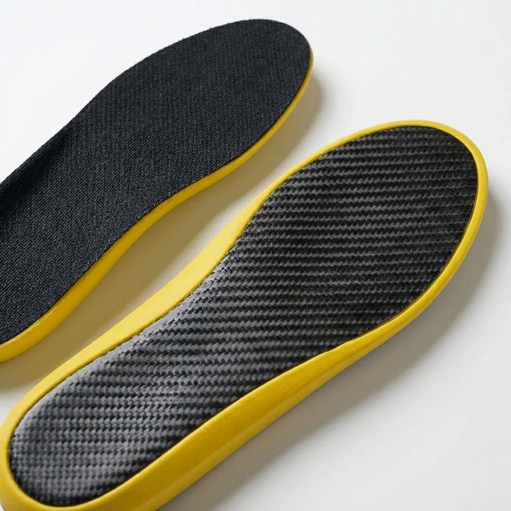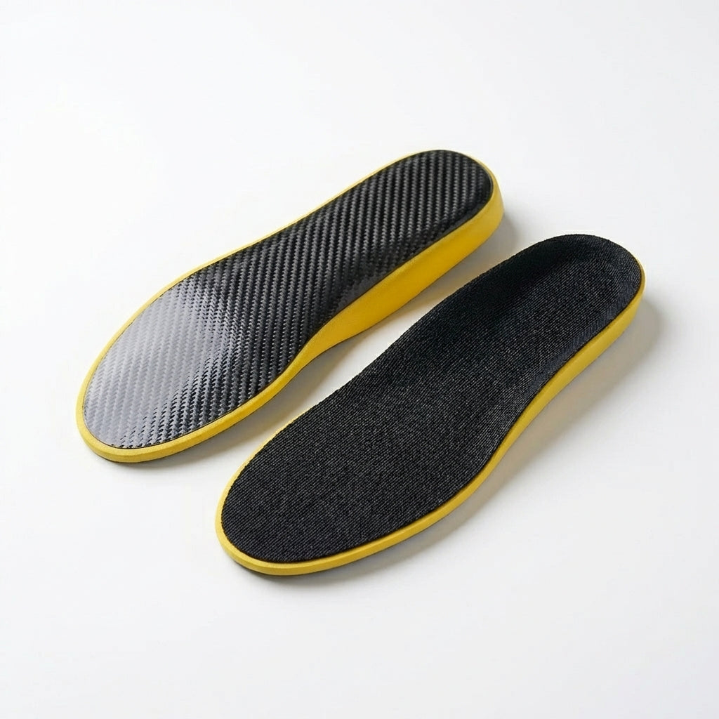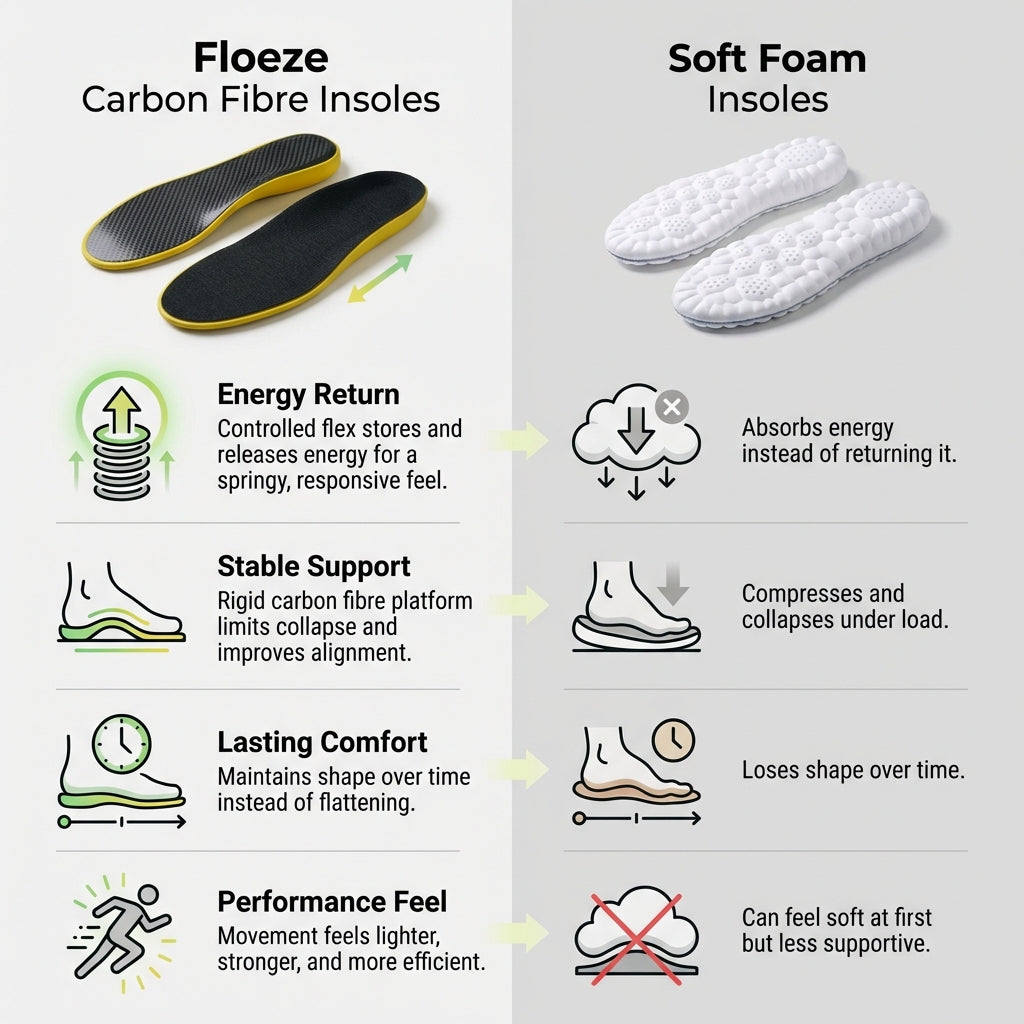 Carbon fibre insoles work by controlling how the foot flexes under load. When your foot strikes the ground, the carbon fibre plate bends slightly, storing mechanical energy. As you move into push-off, that stored energy is released, helping return force back into your stride instead of letting it dissipate into soft foam. By limiting excessive collapse and improving force transfer, this controlled flex reduces strain on foot muscles and connective tissues while making movement feel more efficient, and powerful over repeated steps.